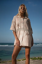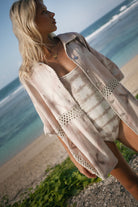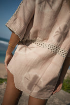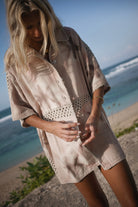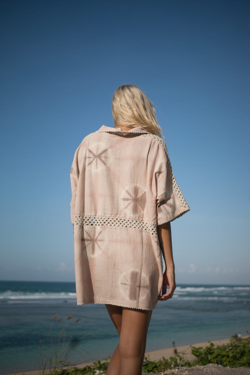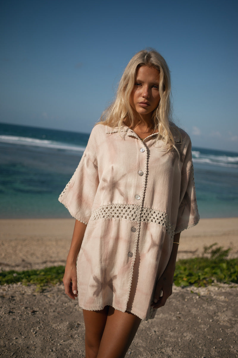 The Forgive and Forget Shirt is made from 100% cotton and hand tie-dyed for soft, tonal depth. Designed in a loose relaxed boxy silhouette with short sleeves, it too features delicate hand-crocheted panels that add a crafted, personal touch.