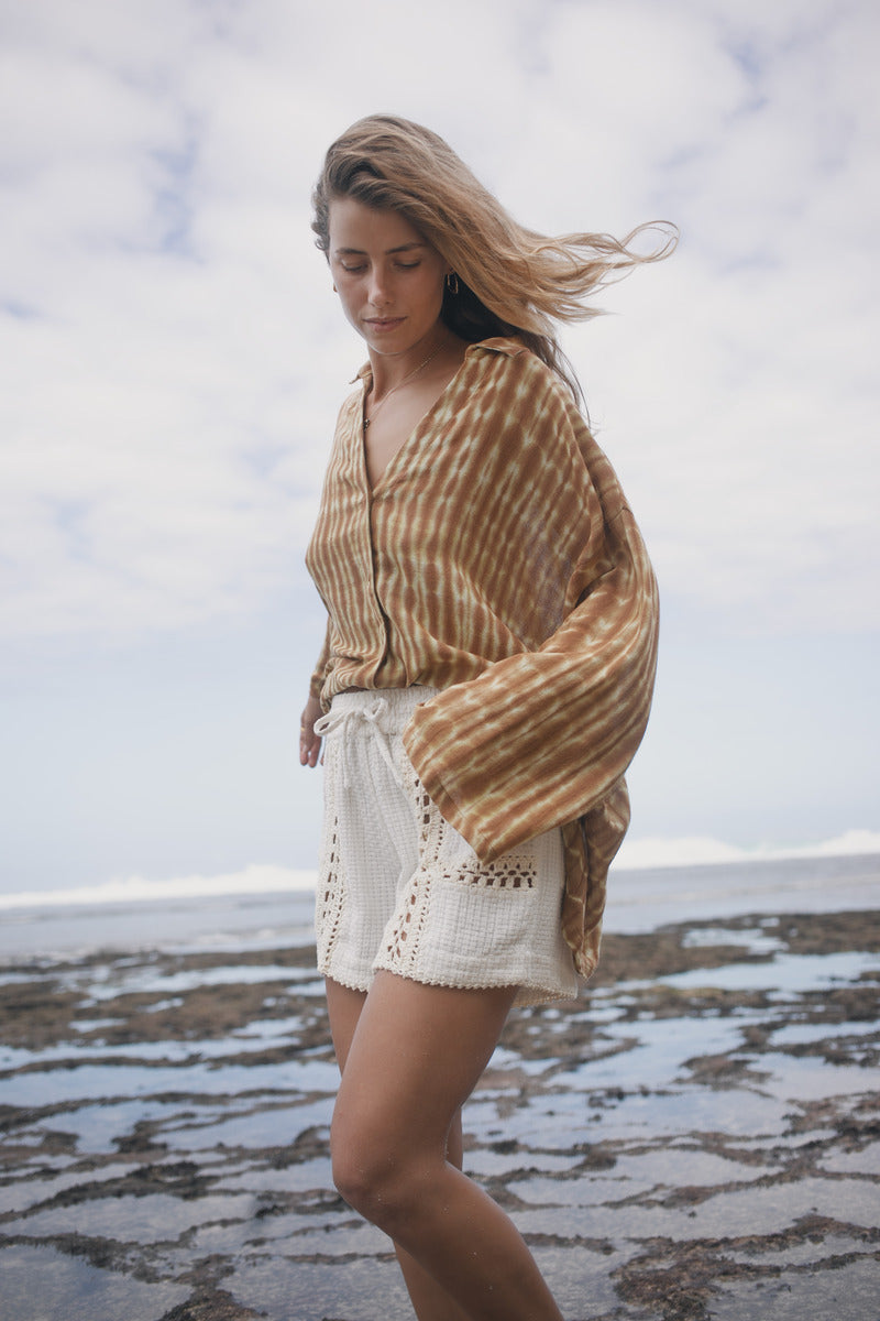 Made from textured 100% cotton in soft Cream, this elevated staple features intricate crochet paneling, handwoven by our skilled artisans in Indonesia.