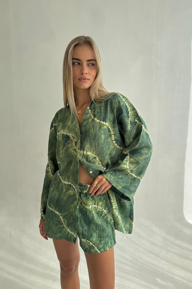 A refreshed mini short added to our most loved Sundowner Green tie-dye, crafted in breathable 100% linen. Featuring a best-selling short shape with elasticated drawstring waistband, this relaxed style is perfect for day-to-day wear.