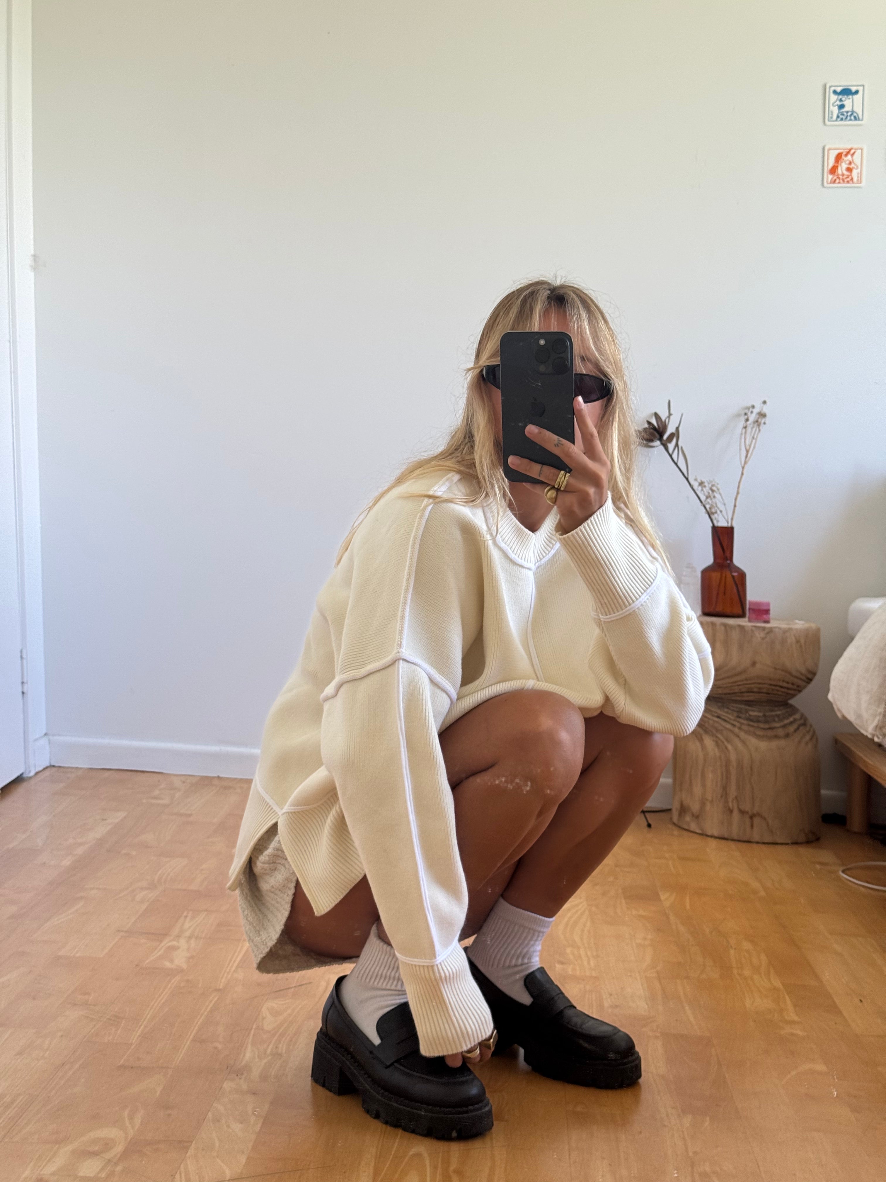 The After Hours crew knit jumper, made from 100% organic cotton, features a soft cream knit with off-white exposed seam details.