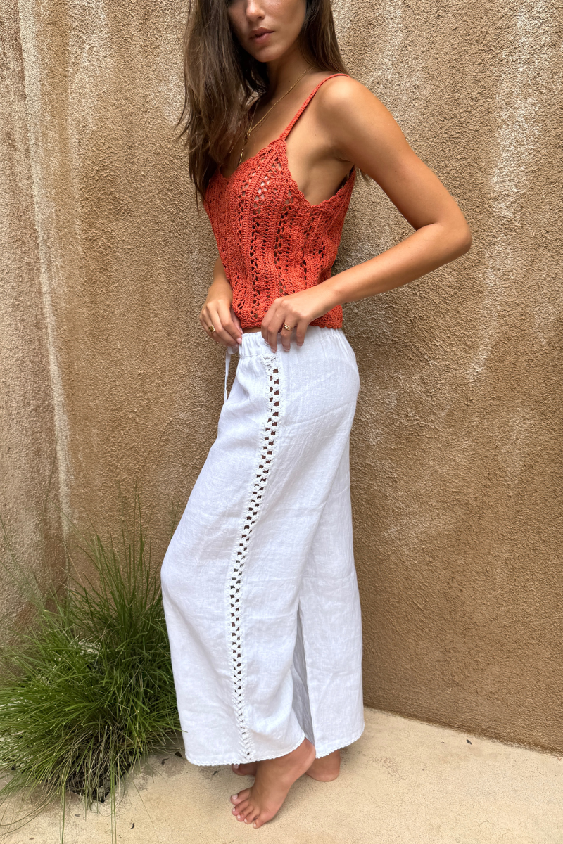The Golden State Pant is handcrafted from 100% white linen, featuring delicate hand-crochet panels placed throughout for a touch of artisanal detail. Designed with an elasticated tie front waistband, and a wide leg, cropped length; the fit is loose and comfortable.