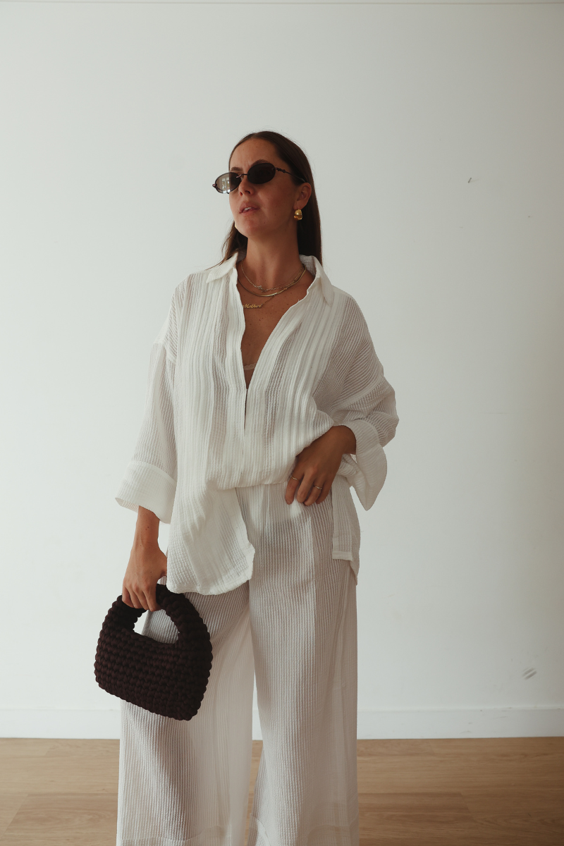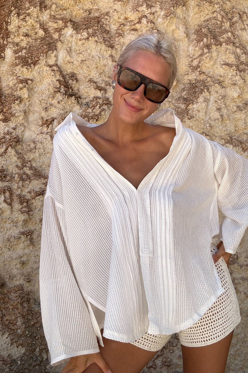 The Journey Home Shirt is crafted from 100% ripple textured stripe cotton in timeless off white.