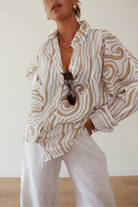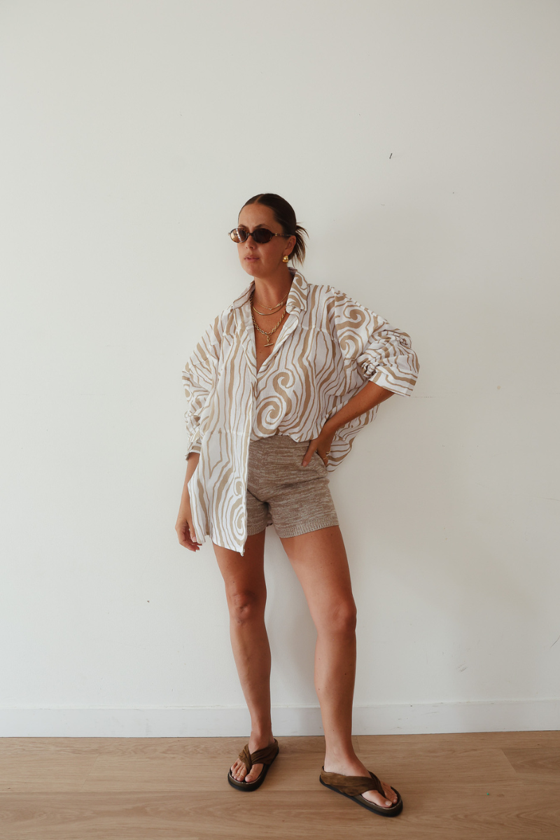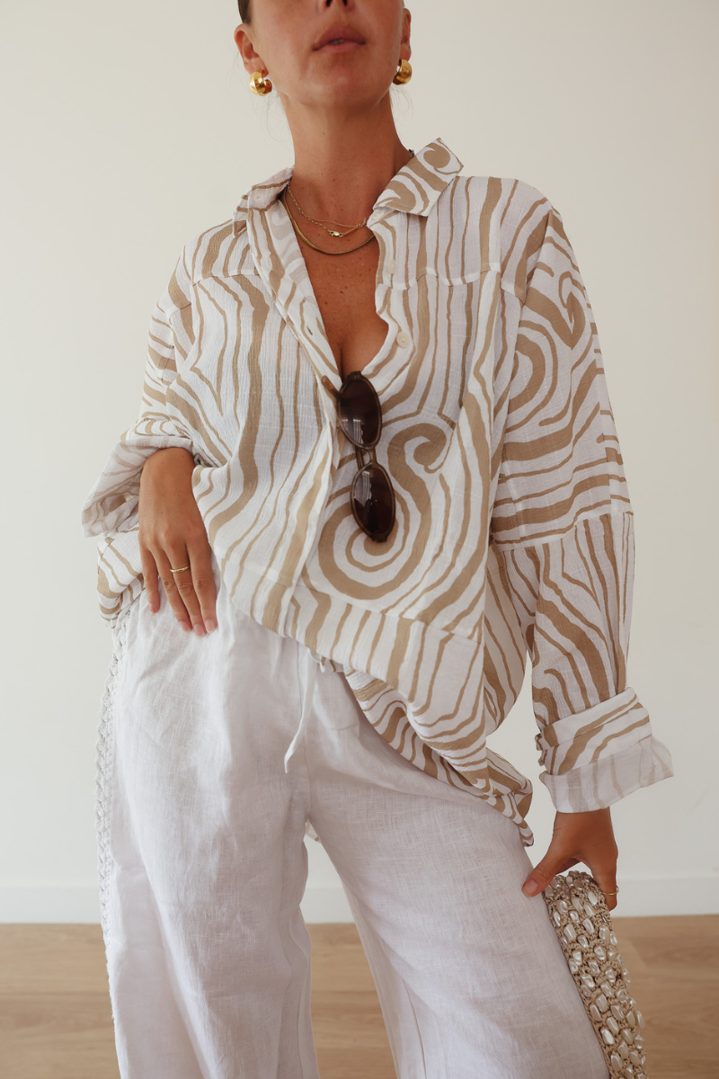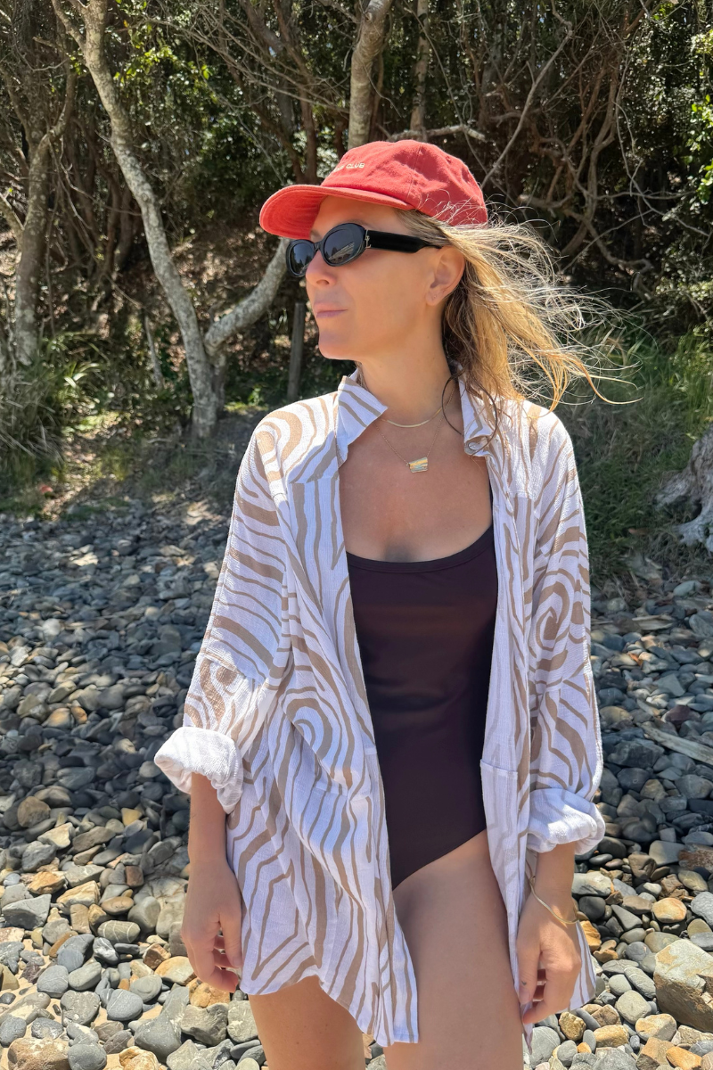 Designed for ease and versatility, it layers over tanks or swim and pairs with denim or tailored bottoms to shift seamlessly from slow mornings to long evenings