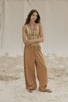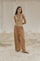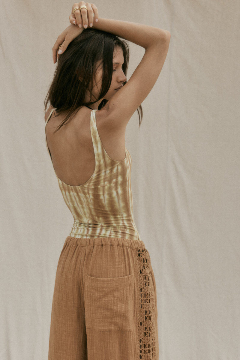 The Wild and Free Scoop Tank Bodysuit is a softly sculpted essential built for ease and everyday movement. Hand tie-dyed by our Indonesian artisans in earthy brown and cream, each piece carries its own quiet character. Cut in our signature cotton-spandex blend, it moves with you; made for layering, lounging, and slow days in flow.