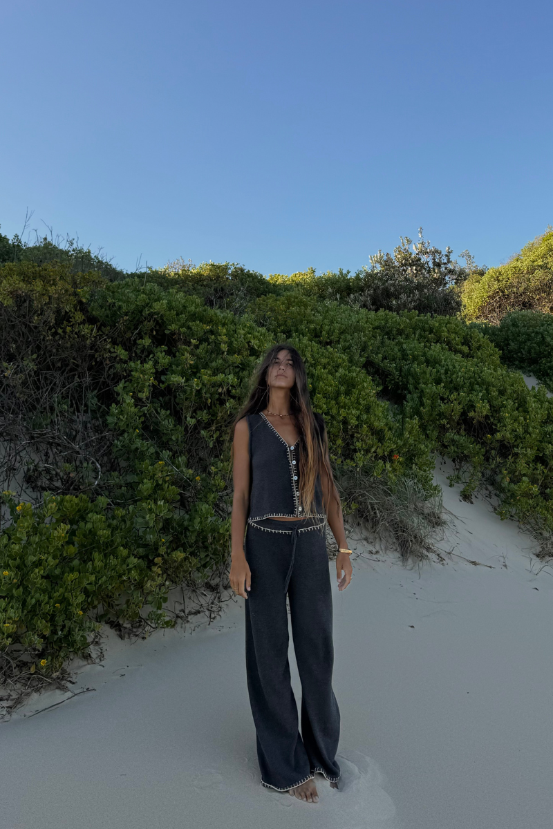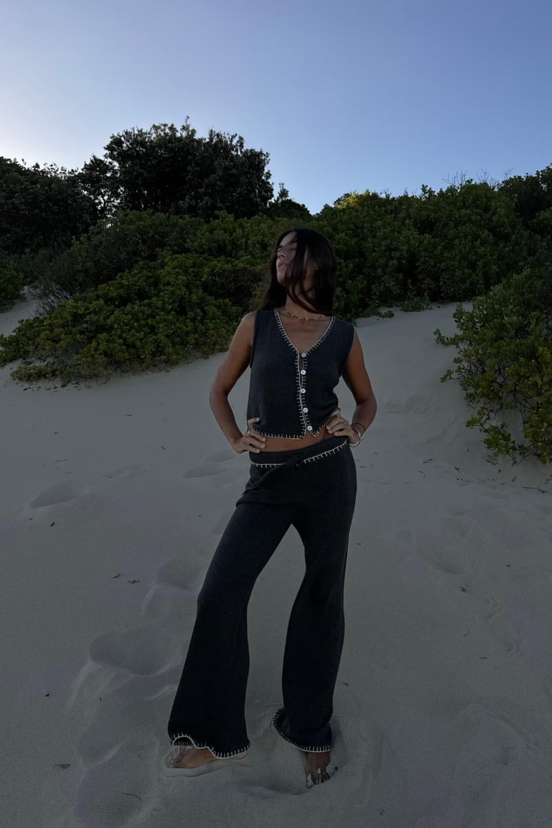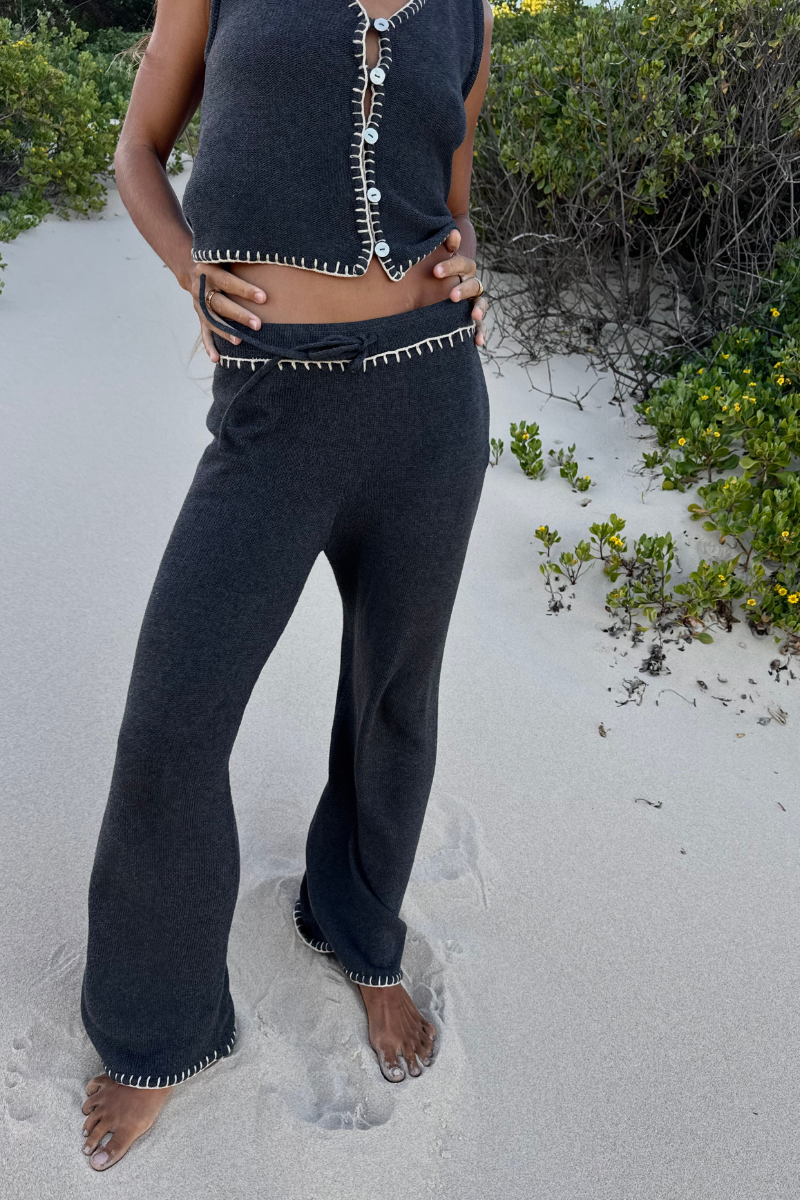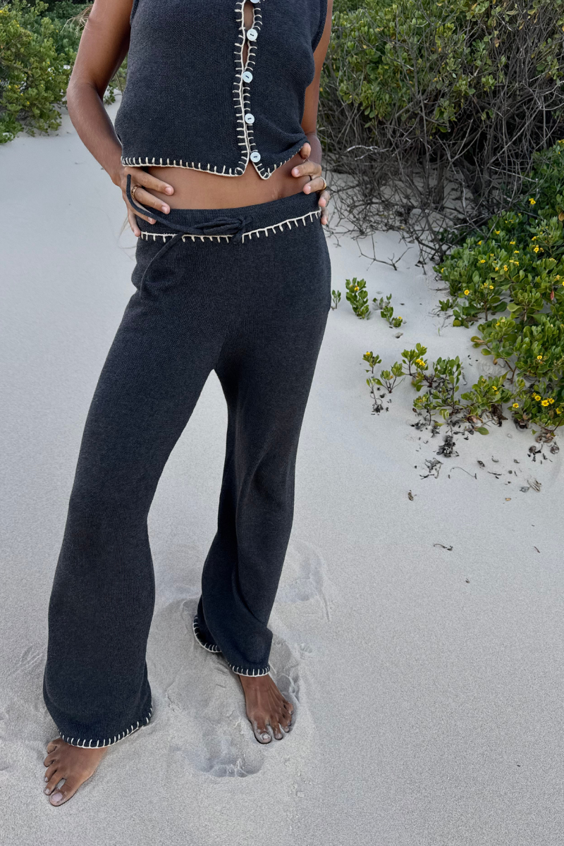 The Earth Days knit pants, made from 100% cotton, feature a relaxed fit, elasticated waistband with tie, and contrast blanket stitch detailing.