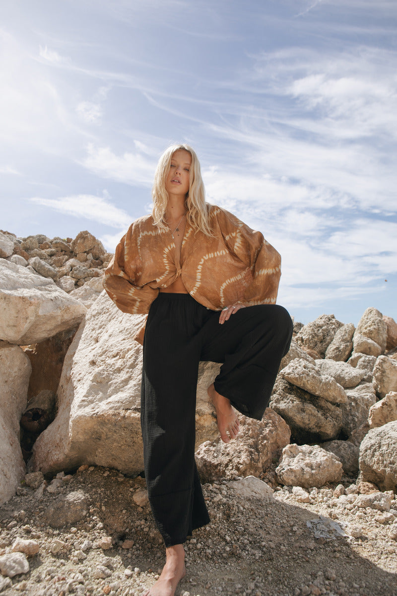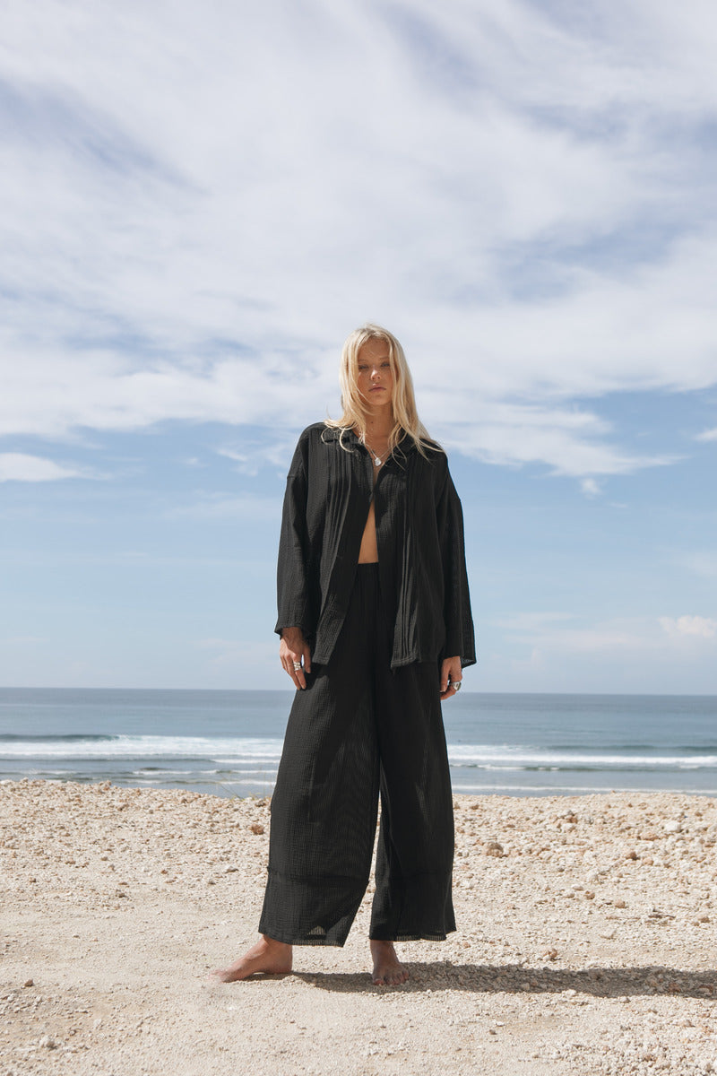 The Journey Home Pant is crafted from 100% ripple textured stripe cotton in timeless Black.