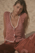 The Lā Lani Vest is a hand-crocheted top in soft rose, crafted by our skilled Indonesian artisans. Designed with a shell button front closure in an intricate open-weave pattern, this timeless piece blends feminine detail with effortless ease.