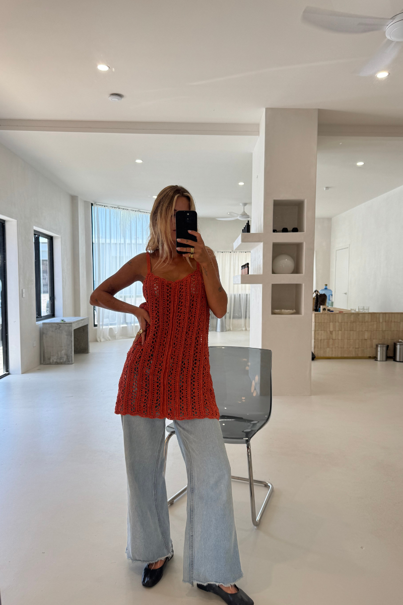 In warm terracotta, its open-weave texture and mini length evoke an airy, carefree spirit perfect for sunlit days and balmy evenings.