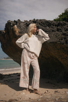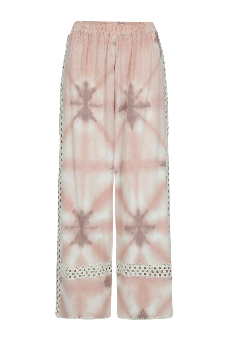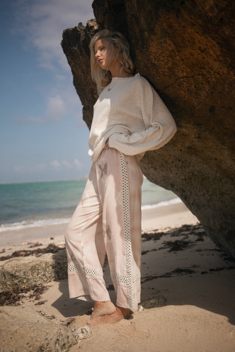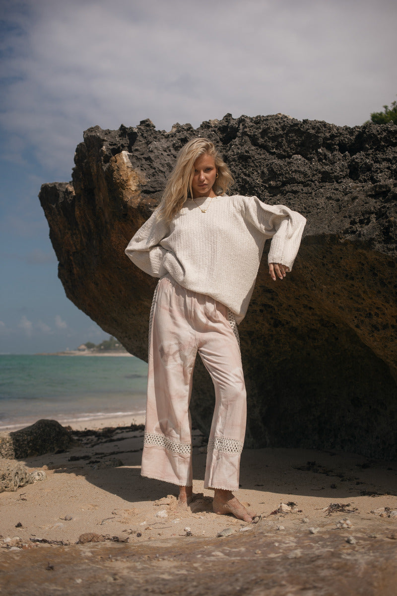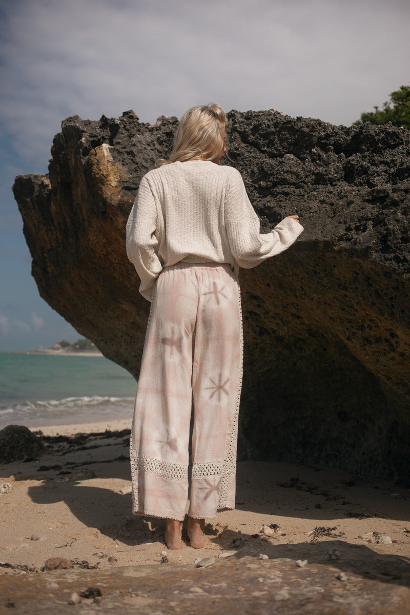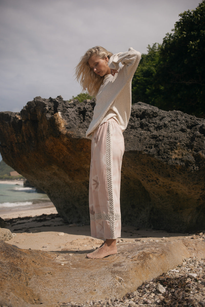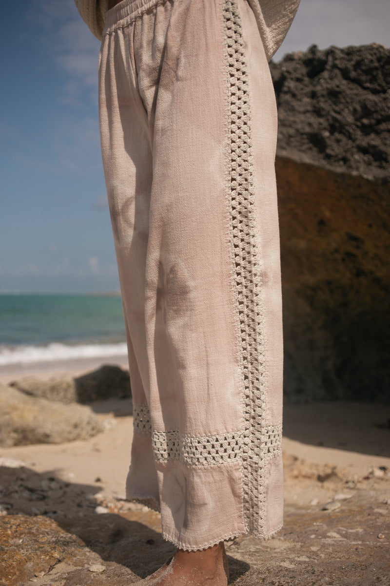 Designed for effortless wear, it features a comfortable elasticated waistband and a relaxed, cropped wide-leg silhouette. Delicate hand-crocheted panels add an artisanal touch—celebrating craftsmanship in every detail.
