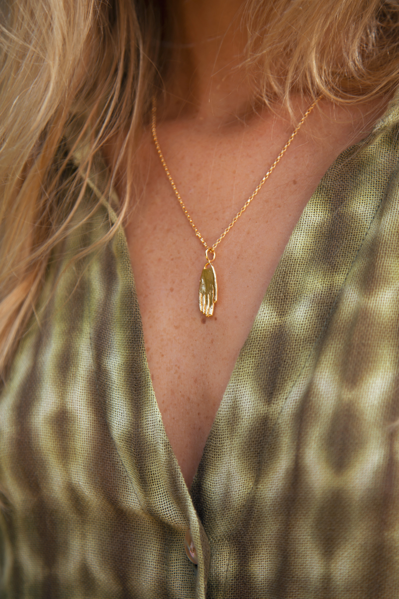 Discover the unique charm of the Hand on Heart Pendant Necklace. Each pendant is hand-carved and cast by skilled artisans, ensuring a one-of-a-kind piece.