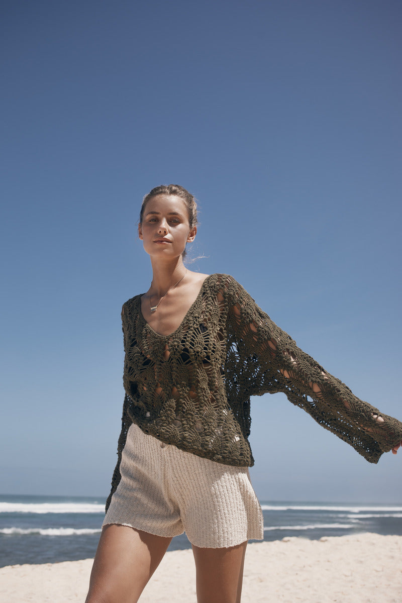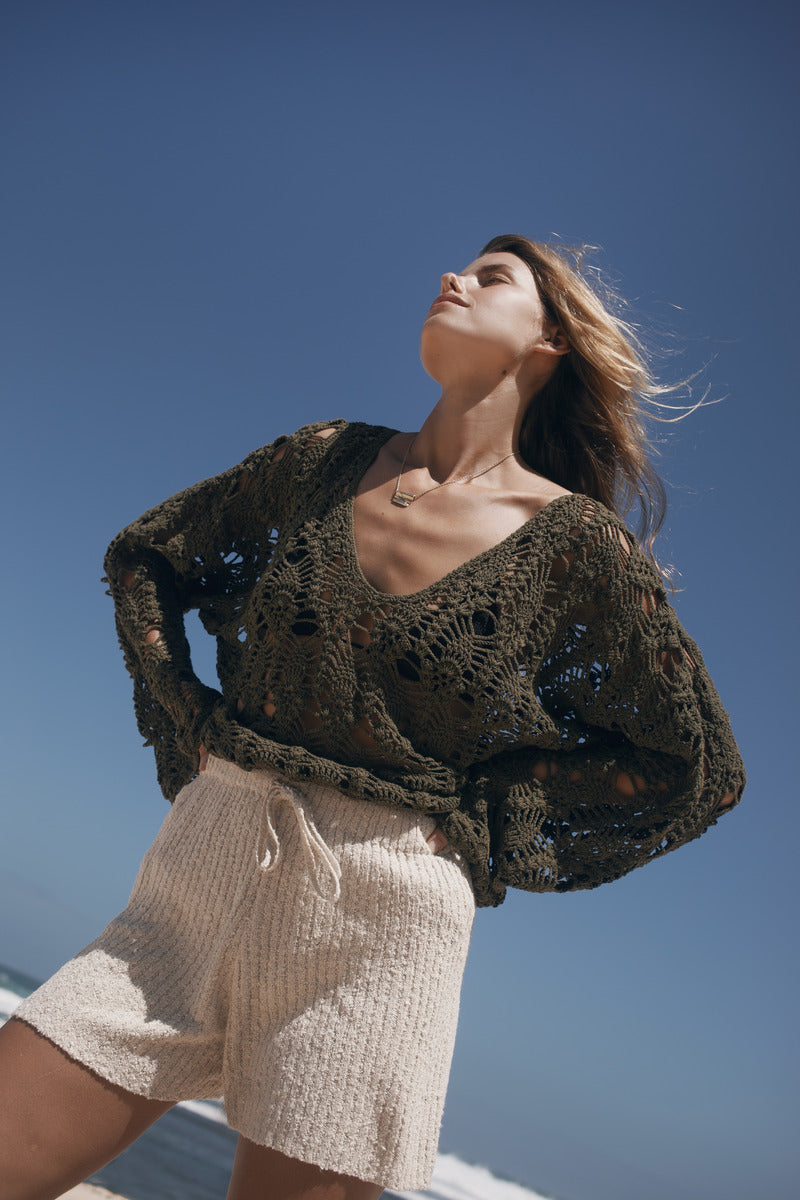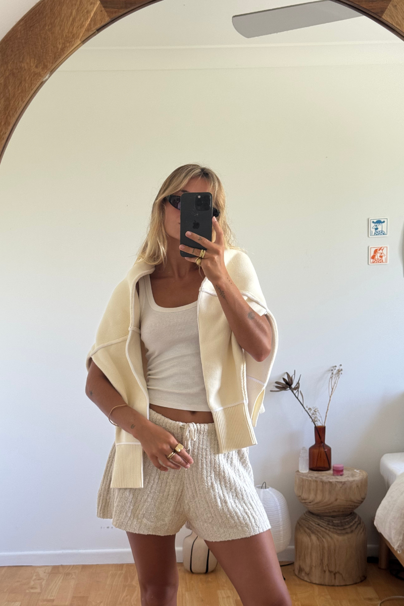 The Soul Space ribbed knit shorts are made from 60% organic cotton, 40% arcrylic textured woven cotton.