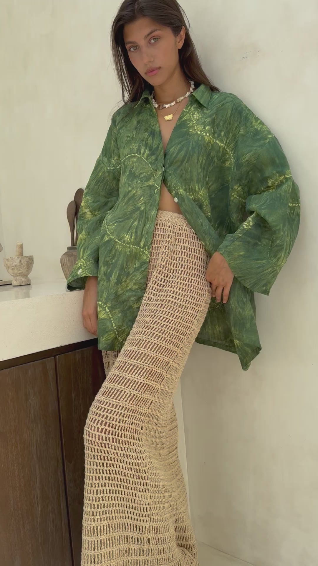 The Sundowner shirt is designed in a deep green hue twisted with traditional tie dye techniques for a classic yet bold effect. Cut from 100% linen, it has an effortlessly chic, oversized silhouette that unbuttons down the centre with a concealed placket. A dropped shoulder leads to wide sleeves that billow in the breeze.